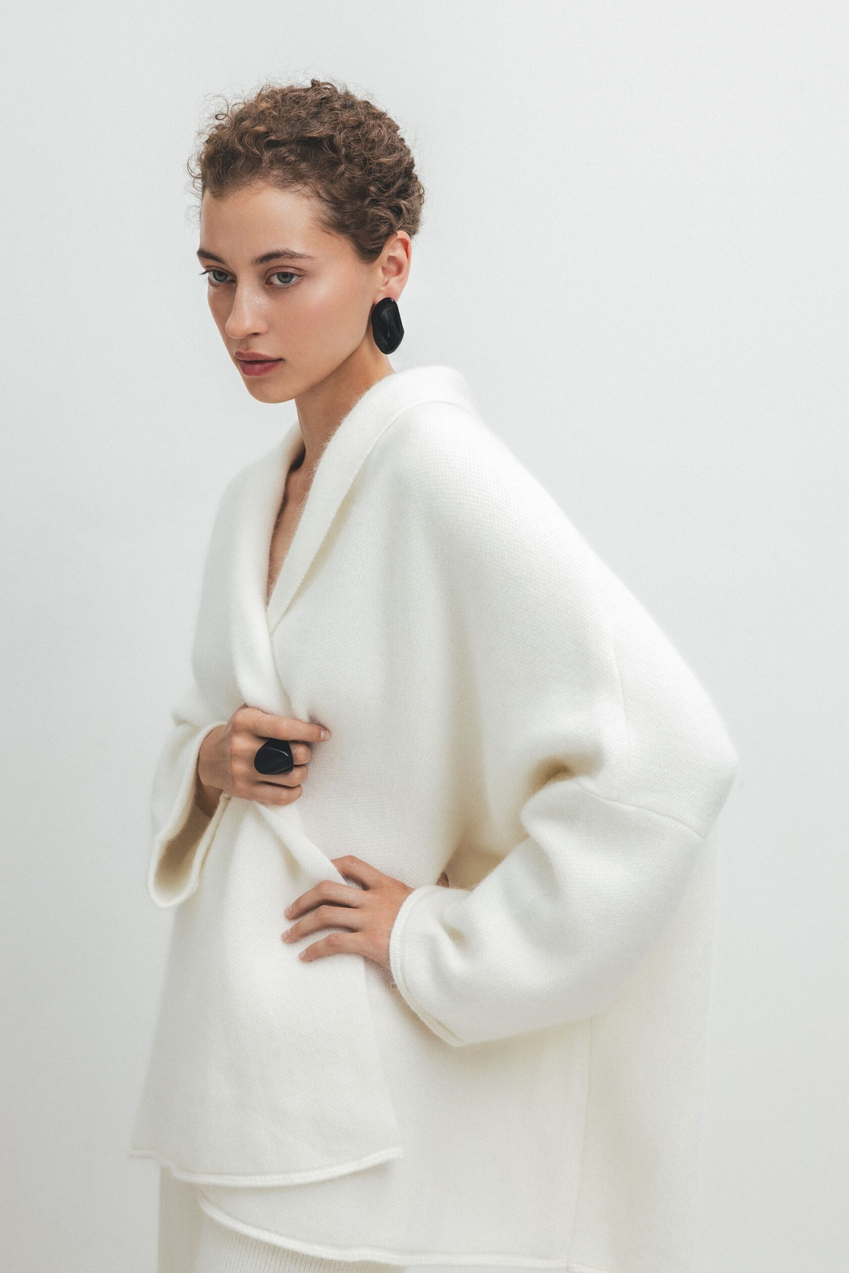 Элегантный трикотажный комплект в кремовом/молочном оттенке: объёмный кардиган‑накидка с поясом и свободные брюки прямого кроя.